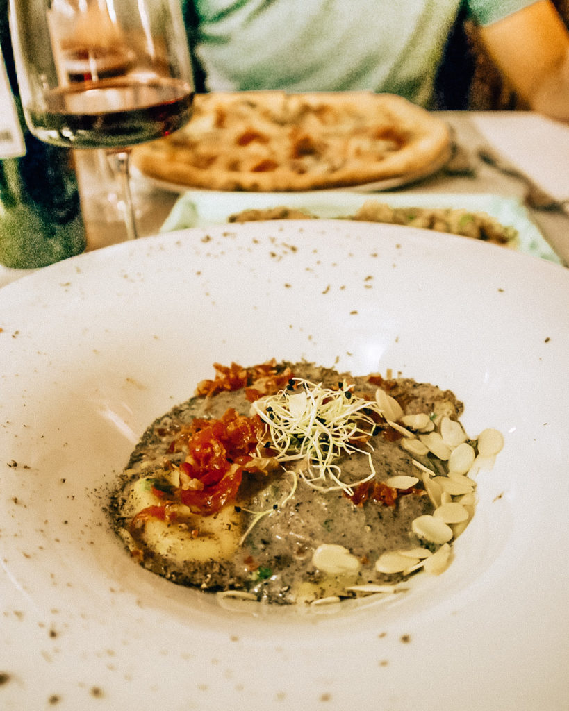 Alors là, franchement, on a eu de la chance car c’était juste à côté de notre AirBnB. D’extérieur, on ne voit pas grand chose du lieu mais vous êtes comme dans un chai avec un plafond en pierre vouté, le tout bien retapé. Là, on s’est fait de la truffe à gogo avec de la scarmoza truffée en entrée, des ravioles de burrata à la crème de truffe, bacon & cèpes ainsi qu’une pizza truffe et speck en plat et même un dessert à partager sans oublier une bonne bouteille de rouge. C’était le repas pour nos 1 an de mariage avec mon Paulo, à 60€ seulement !